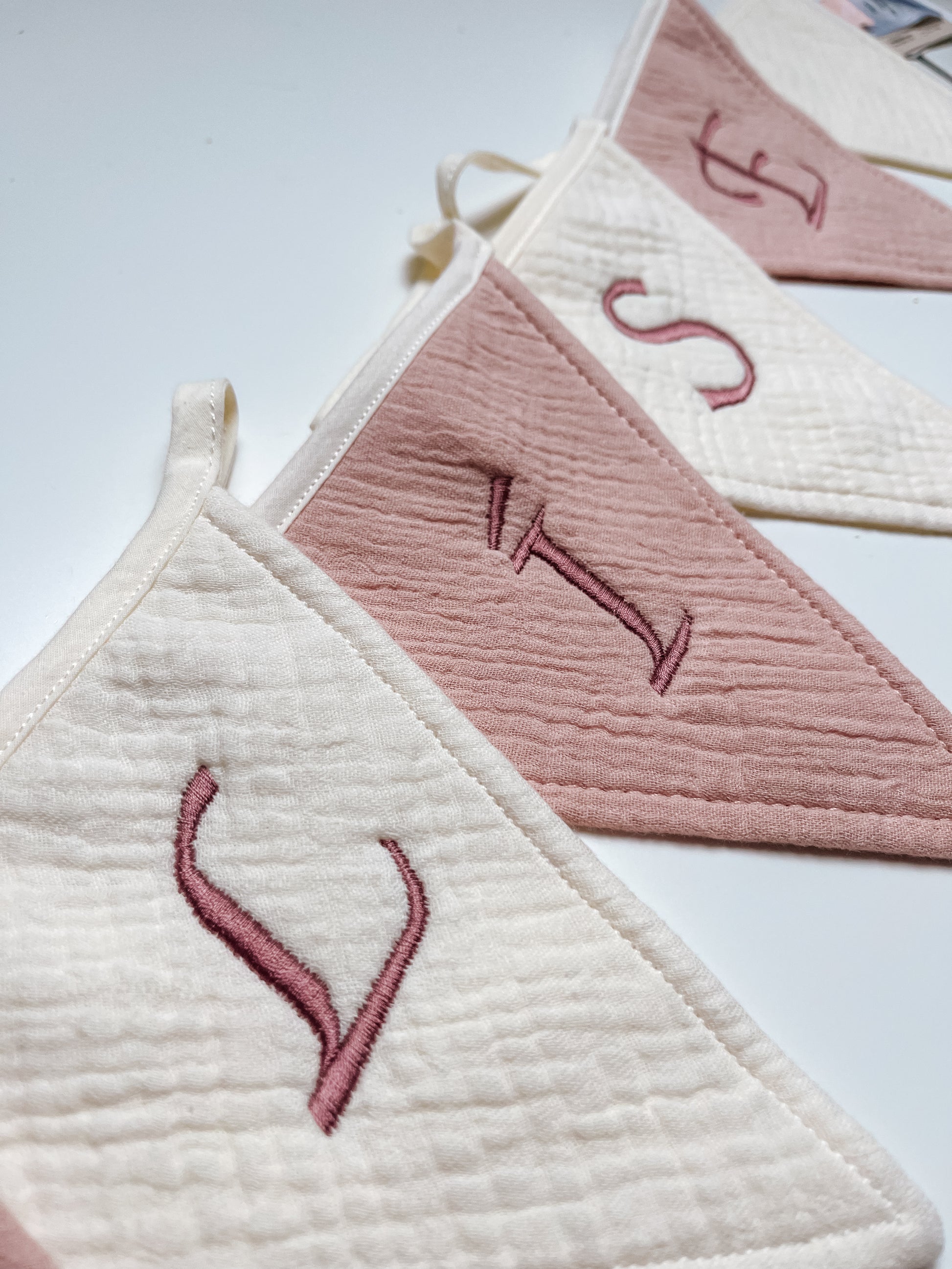 Deze vlaggenlijn bestaat uit stoffen vlaggetjes, in Roze & Ivory kleur.