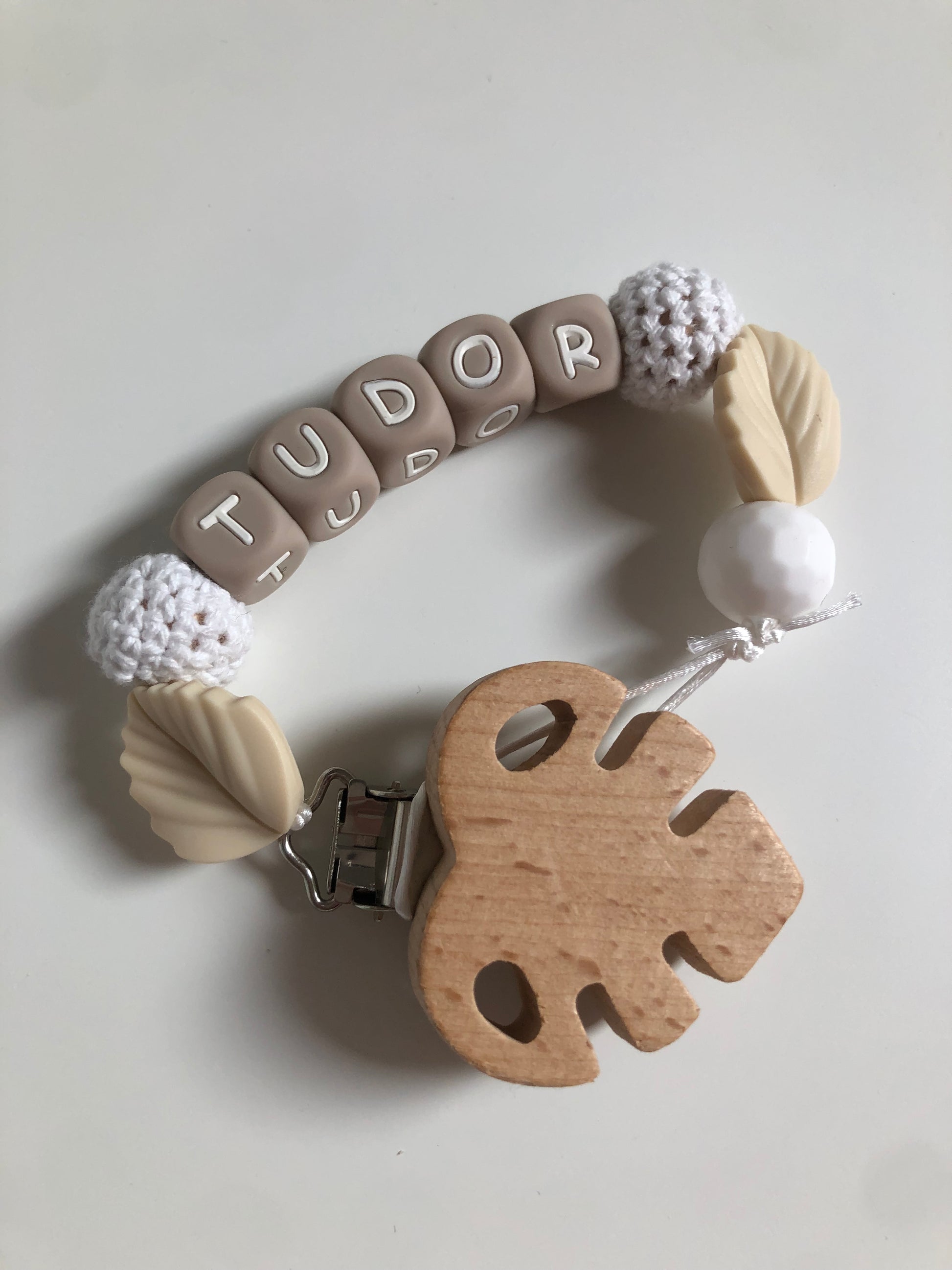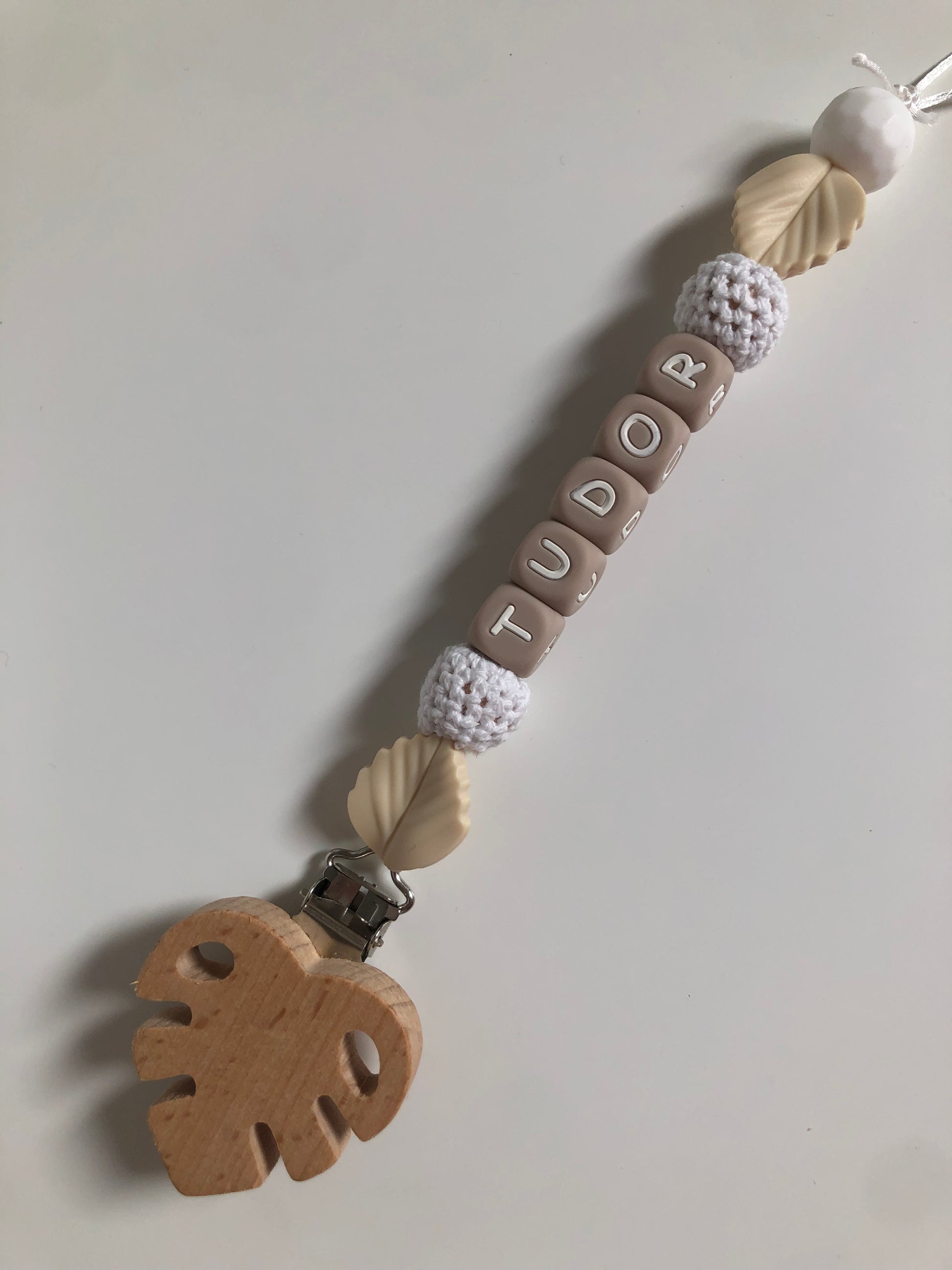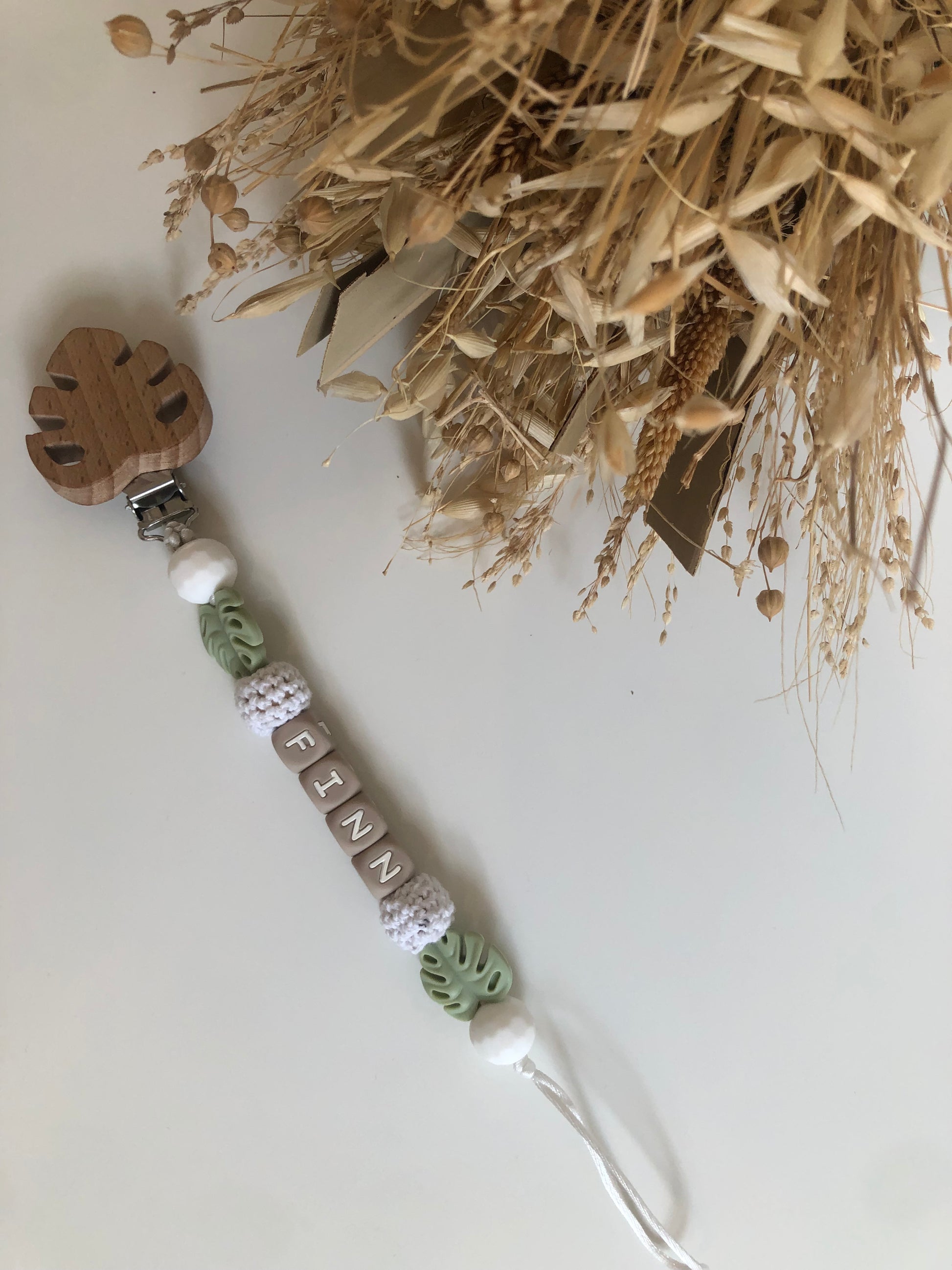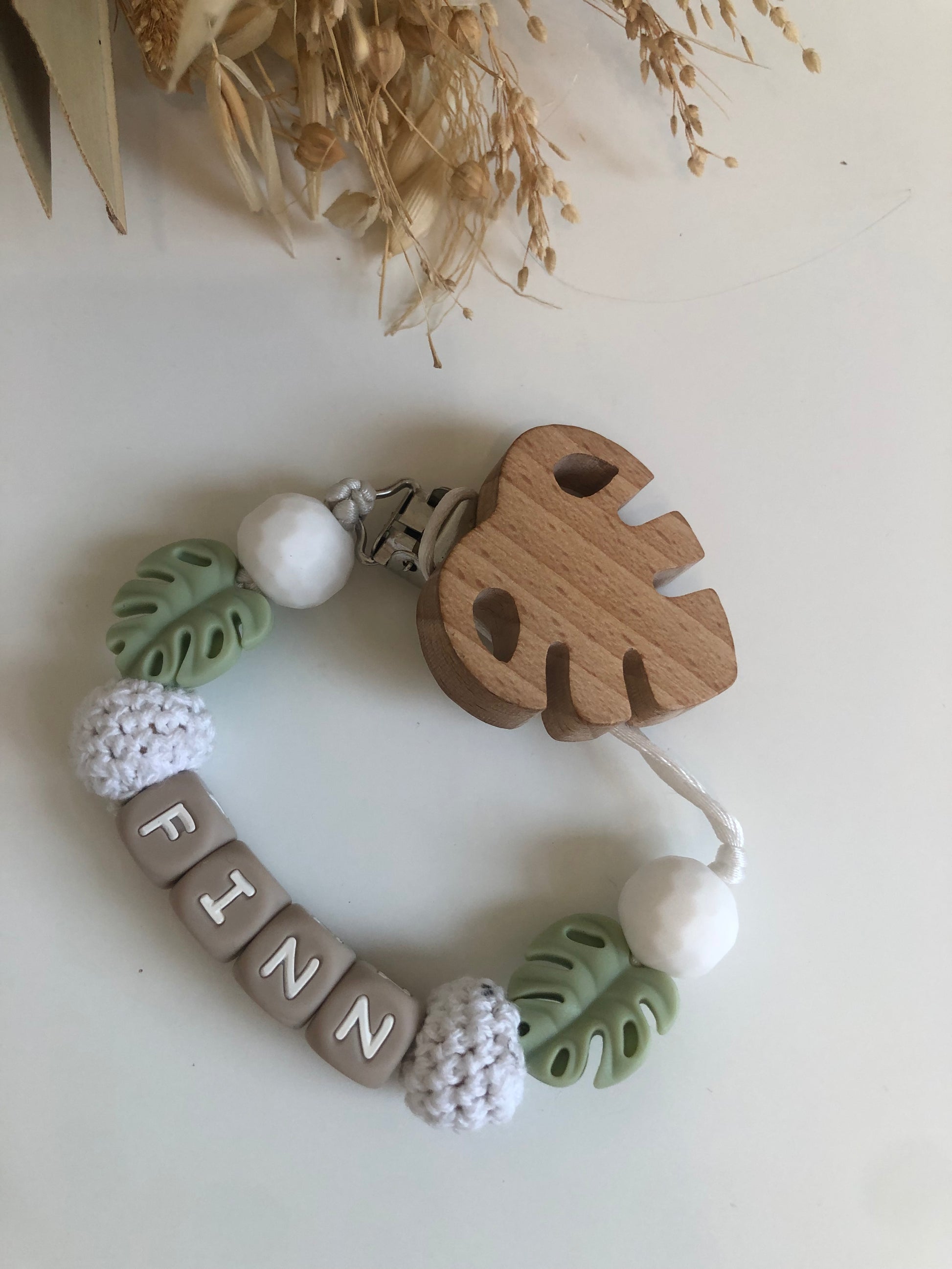 Dit speenkoord is in het thema 'jungle', afgewerkt met leuke blaadjes én de naam van je kindje.