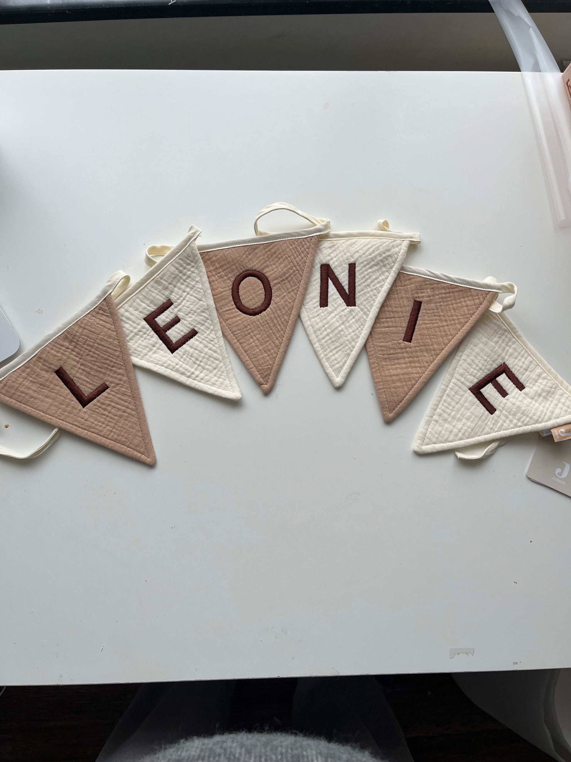 Deze vlaggenlijn werd geborduurd met naam ‘Leonie’